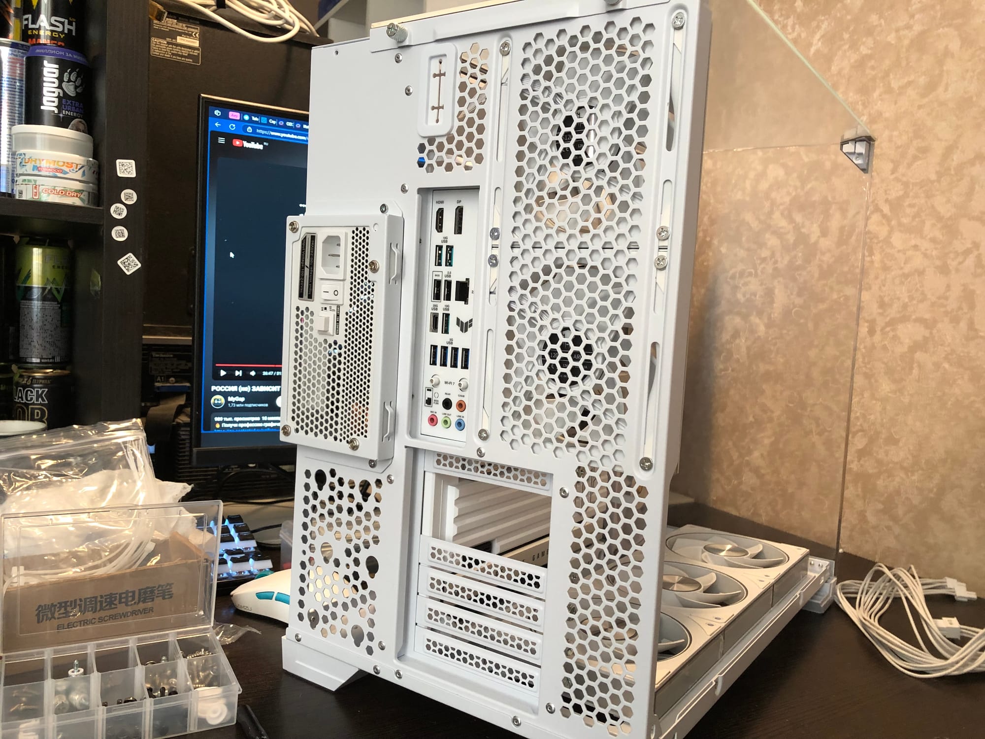 За питание отвечает киловаттник 1stPlayer Platinum. Блок топовый, модульный, с красивыми плетеными кабелями. По сборке: кабель-менеджмент здесь оказался сложнее, чем кажется. Хоть разъемы и сзади, уложить жесткие плетеные провода аккуратно — та еще задача, но опыт помог сделать все чисто.