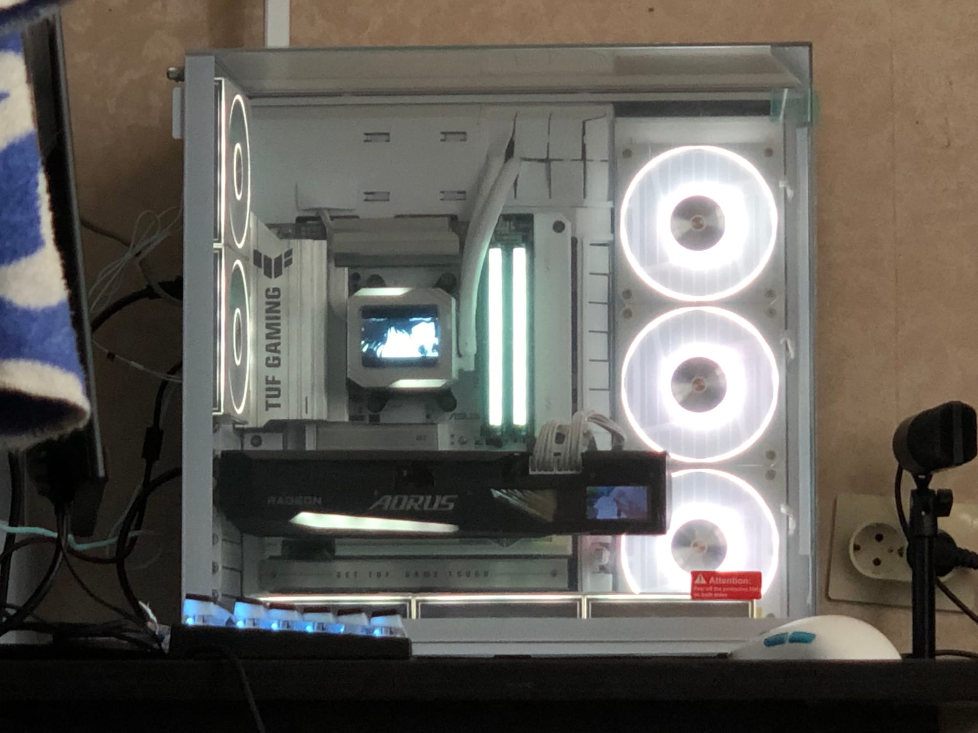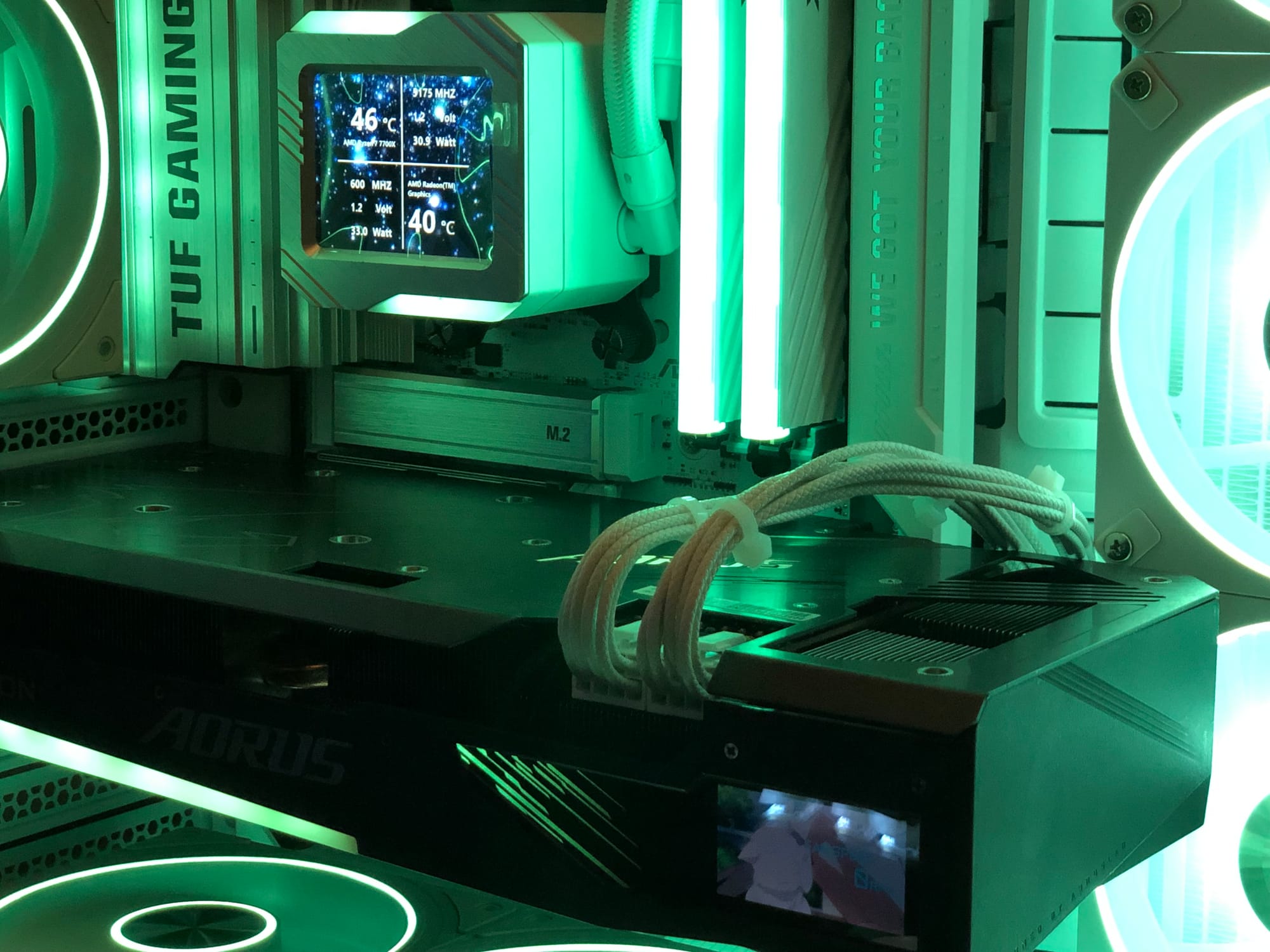 Внутри стоит Radeon RX 6800 XT от AORUS. Карту брали с рук (привоз из Китая). Перед установкой я провел полное вскрытие: состояние идеальное, термопаста свежая, прокладки не потекли, память не перегрета. Визуально карта отлично вписалась в билд, а встроенный LCD-дисплей на боку стал дополнительным акцентом.