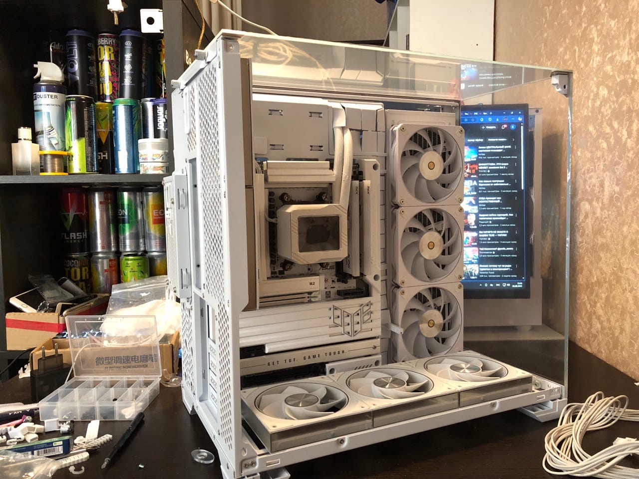 Был небольшой нюанс с охлаждением корпуса: реверсивные вентиляторы приехали другой модели и немного отличаются по дизайну от тех, что стоят на воде. Из-за поджимающих сроков решили оставить как есть — в реальности разница в глаза не бросается, а выглядят они даже интереснее стандартных. ( просто на сжо подсветка чуть менее качественная и работает также на лопасти )